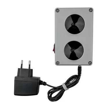 Do odstraszacza łatwo podłączysz zasilacz do sieci 230 V, a gdy zechcesz to równie łatwo podłączysz dodatkowy zasilacz na baterie. W ten sposób możesz korzystać z odstraszacza wszędzie gdzie zechcesz - w domu albo na dworze, tam gdzie jest sieć 230 V albo tam gdzie nie ma prądu w ogóle. Wystarczy podłączyć zasilacz na baterie. Zajmuje to zaledwie kilka sekund. Pobór prądu jest minimalny dlatego baterie wystarczą na kilka tygodni całodobowej pracy.